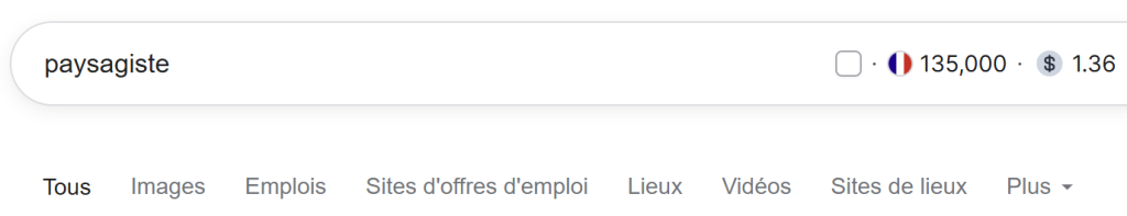 Nous constatons que pour la requête “paysagiste”, après l’onglet “Tous” regroupant les premiers résultats pertinents, nous avons ensuite “Images”, puis “Emplois”, etc…